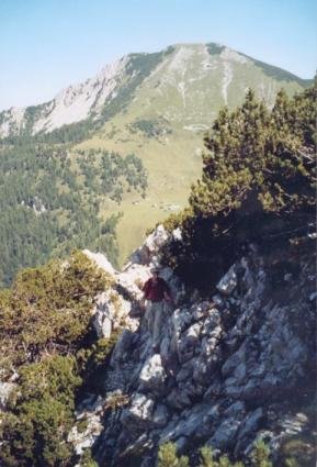 Im mittleren Teil des Hochstuhl-Klettersteigs, im Hintergrund der Kosiak (Geißberg).,