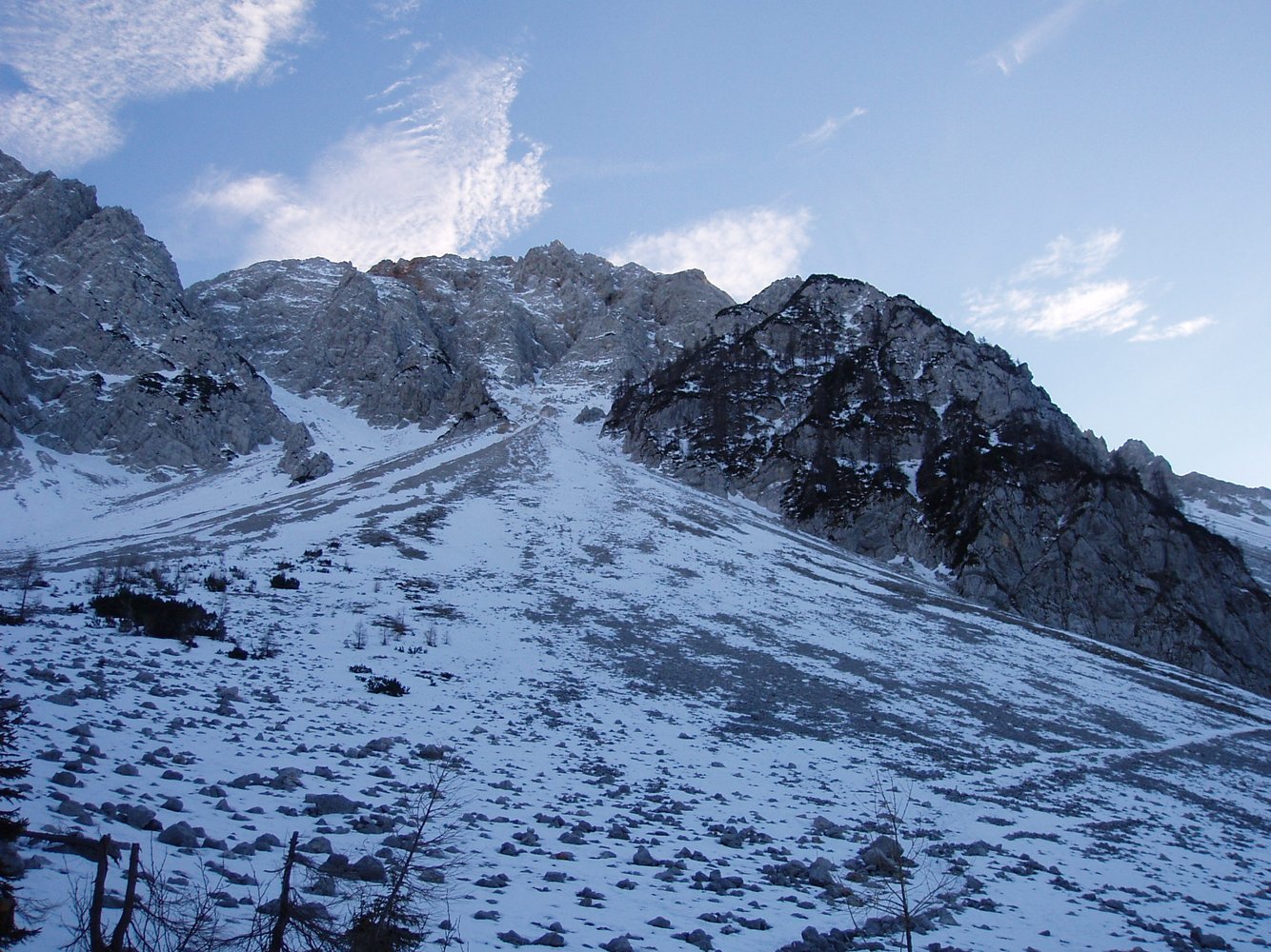 Vom Parkplatz "Im Winkel" auf der Forststraße vorbei an der Johannsenruhe taleinwärts. Im Wald in einigen Serpentinen empor und in der sogenannten Karkehre die Forststraße verlassen. Auf Weg 664 über ein Schuttfeld ansteigend zum Einstieg (N 46°26'26,0", O 14°10'11,8").