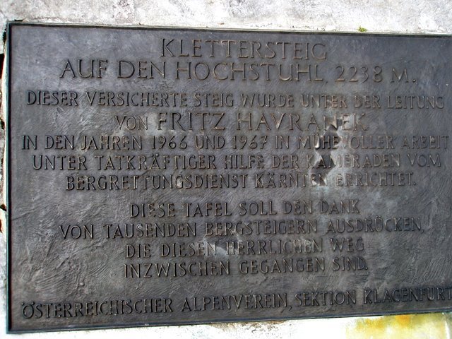 Dieser Klettersteig führt über die Nordflanke auf den höchsten Gipfel der Karawanken. Er wurde 1966/67 errichtet, um einen (relativ) einfachen Zustieg von österreichischer Seite auf den Hochstuhl zu schaffen. Vor einigen Jahren wurde der unterste Teil neu angelegt und stellt jetzt die Schlüsselstelle dar.
