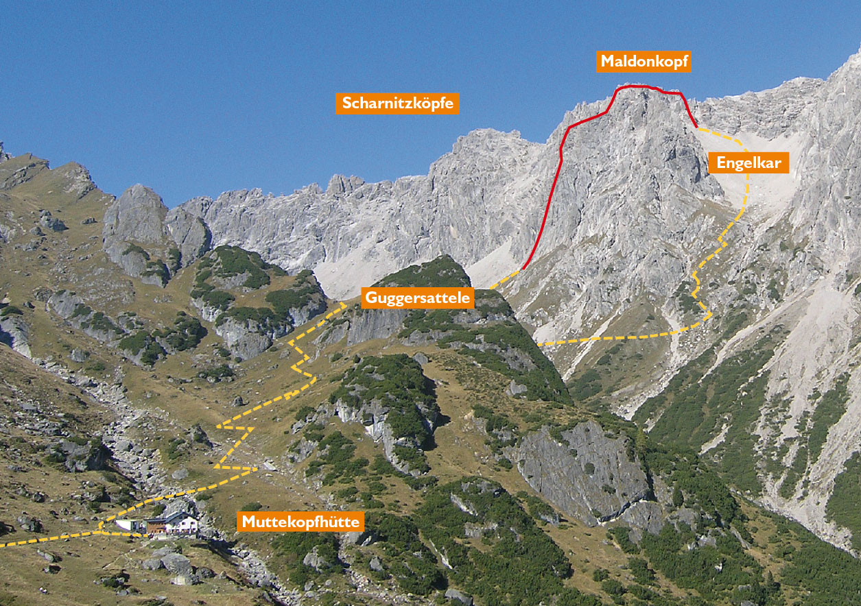 Von Hochimst auf Weg 621 (Forststraße) zur Untermarkter Alm. Über die Schipiste rechtshaltend zur Latschenhütte. Weiter auf Weg 621 zur Muttekopfhütte aufsteigen. Von hier über Weg 622 auf das Guggersattele und ins Scharnitzkar. Dem Wegweiser folgend rechts abzweigen und über Geröll zum Einstieg.