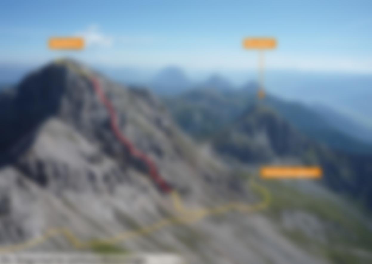 Links einer steinschlag gefährdeten Rinne hinauf (B), brüchige Querung nach rechts und über den ersten Grataufschwung(C/D) empor. Es kommt ein falches Gratstück, ein kurzer steiler Aufschwung (D) und ein kurzer Grat zu einen großen Turmaufbau. Über Platten linkshaltend (C/D) in die markante, steile Kaminverschn. (C) und zuletzt sehr ausgesetzt (D) auf den Turmgipfel. Über den flachen Grat (A) und den letzten steilen Aufschwung (C/D) zum Ausstieg. Linkshaltend über Steigspuren zum Westrücken und in Kürze auf den Gipfel