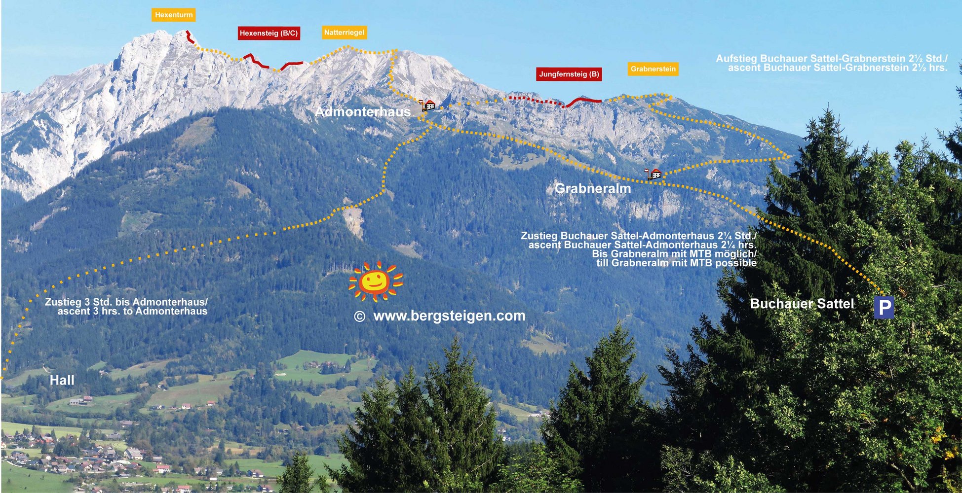 Vom Ausstieg dem Wanderweg zum Gipfel des Grabnersteins folgen. Der Abstieg vom Gipfel zur Grabneralm ist als Almlehrpfad angelegt. Ab der Grabneralm weiter über den Aufstiegsweg.