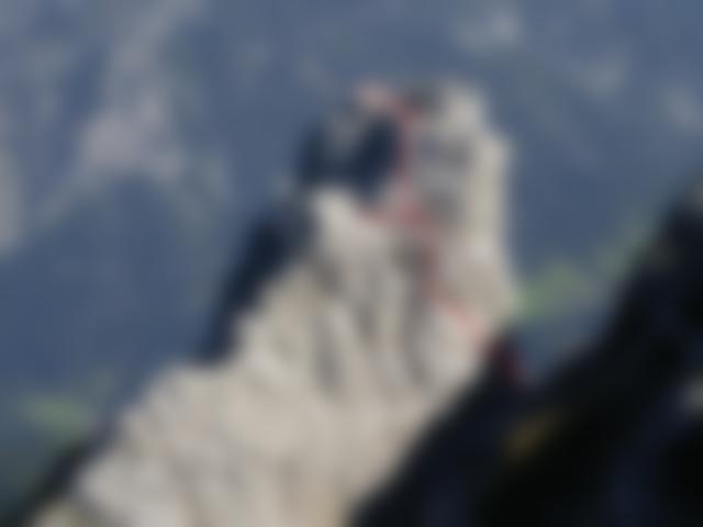 Der Abstieg beginnt mit einem Spreizschritt (B) über einem Spalt. Vom kleinen Gipfelplateau klettert man steil mit Hilfe von Klammern (zuerst C, dann C/D) zur Vereinigung mit der Umgehungsvariante. Unter einem Überhang auf einer Platte nach rechts querend absteigen (zuerst B, dann B/C). Steiler (C) und anschließend leicht überhängend durch einen Kamin (D) in die Lärchenscharte.