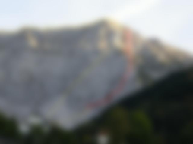 Vom Einstieg durch einen Kamin (B) zu einer Platte (C). Leicht (A) nach rechts zu einem mit Klammern versicherten Überhang (C) queren. Auf einem Band (A) zu einer Felsstufe (B). Nach einer Platte (C/D) führt ein erdiger Pfad (meist A, eine Stelle B/C) durch die Latschen. Es folgt eine Querung nach rechts (A). Über eine Platte (B) und anschließend wieder erdig (A/B) zu einer Verschneidung (B/C). Nach kurzer Rechtsquerung geht es direkt an der Kante (meist A/B, eine Stelle B/C) eines Pfeilers empor. Kurz abklettern (A) und durch erdiges Gelände (A) zu einem Band (A). Es folgt eine Querung nach rechts (A). Unter einem Überhang (C) geht es an eine Kante. Durch einen Kamin (B/C) auf den flachen Grat (A).