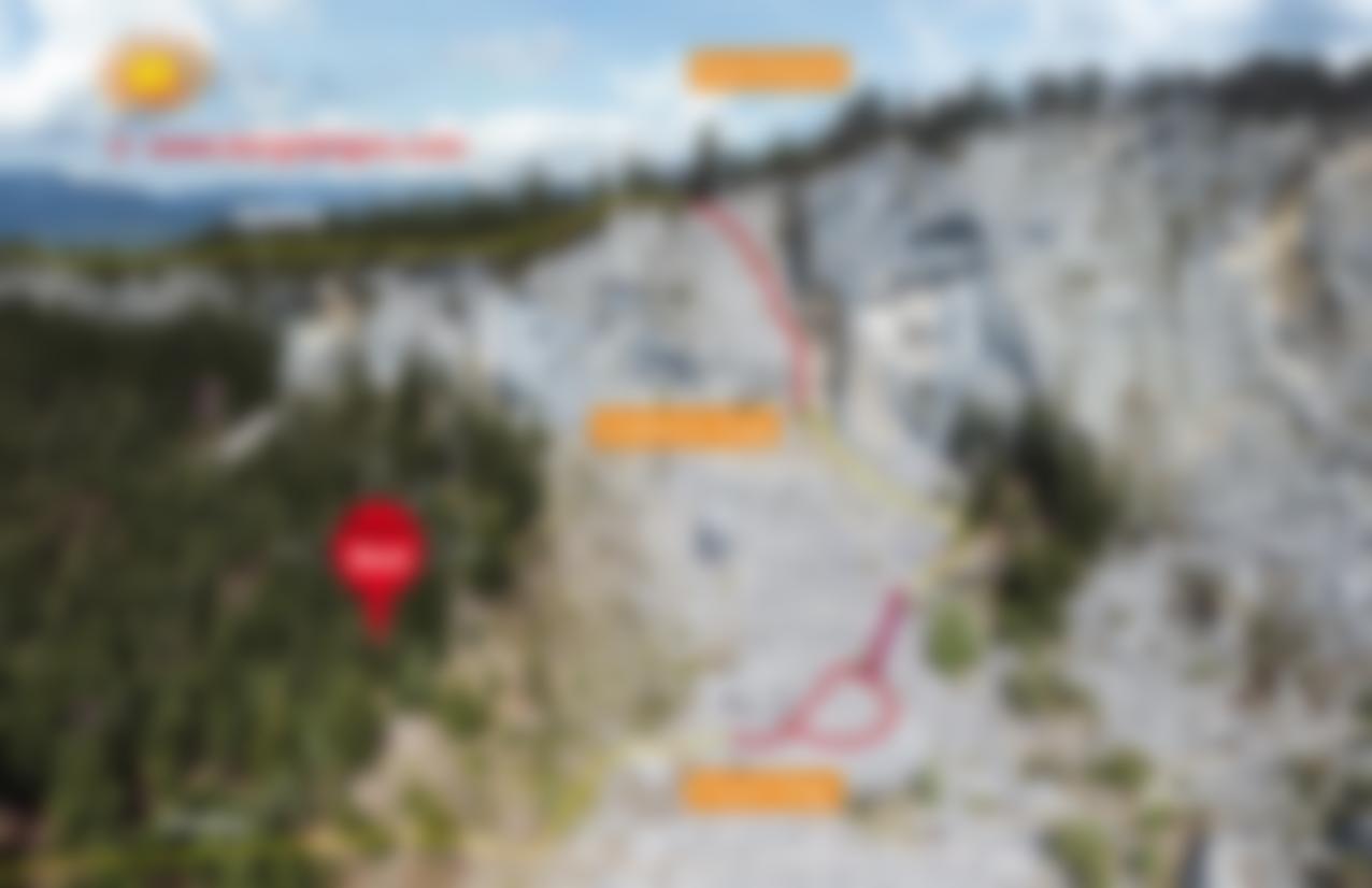 Siehe Topo. Diese Toposkizze ist anfangs nur den Kunden unserer Klettersteigführer bzw. Touren-App vorhalten, da diese Klettersteiggeher uns durch den Kauf unserer Produkte dankenswerterweise unterstützen.