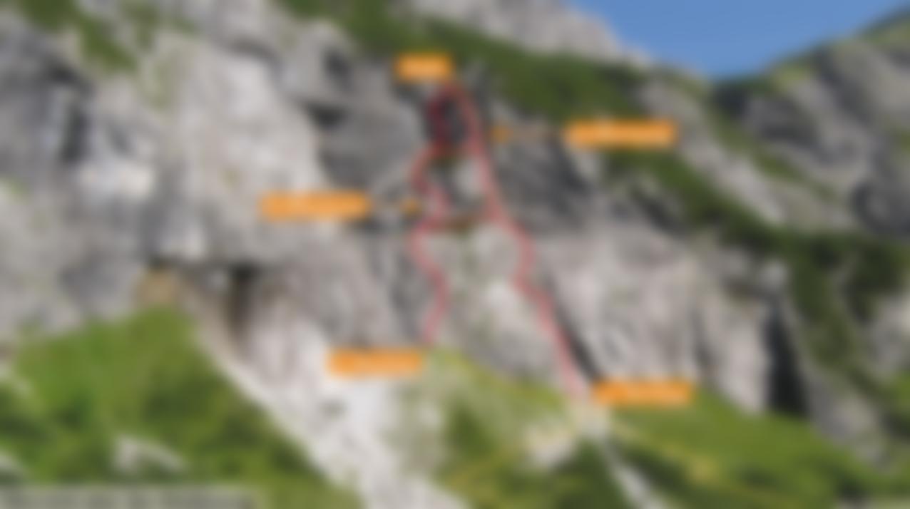Komplette Klettersteigausrüstung und Helm; für schwächere Geher ein Sicherungsseil.
