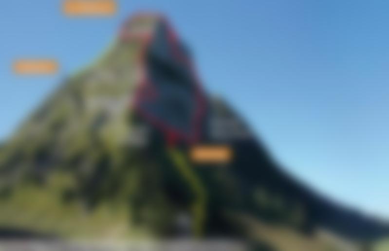 Siehe Topo. Vom Einstieg bei einer Tafel der linken Route hinauf auf ein Band folgen (B). Dort nach links zur Kante queren (A) und kurz hinauf (B) zur Abzweigung der Extremvariante bei einer Tafel. Die Variante quert unter einem großen Überhang, überwindet diesen am rechten Rand (D) und führt danach in einer Schleife zurück zum Grat, wo sie wieder auf die Normalroute, die dem Grat gerade folgt (B), trifft. Wieder vereint geht es über einen glatten Pfeiler (C) und einige kleinere Gratpfeiler (B) hinauf zum großen Band, auf dem man verschnaufen kann. Weitere kurze Pfeiler (B) führen auf das nächste Band, dem man nach links (A) zum Abschlussgrat folgt. Auf dem Grat zuerst kurz schwer (C), dann deutlich leichter hinauf zum Grasrücken, über den man auf den Vorgipfel (1936 m) gelangt.