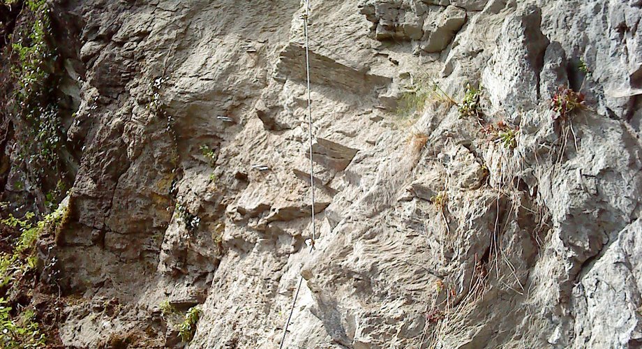 Komplette Klettersteigausrüstung; für Schwächere ein Sicherungsseil.