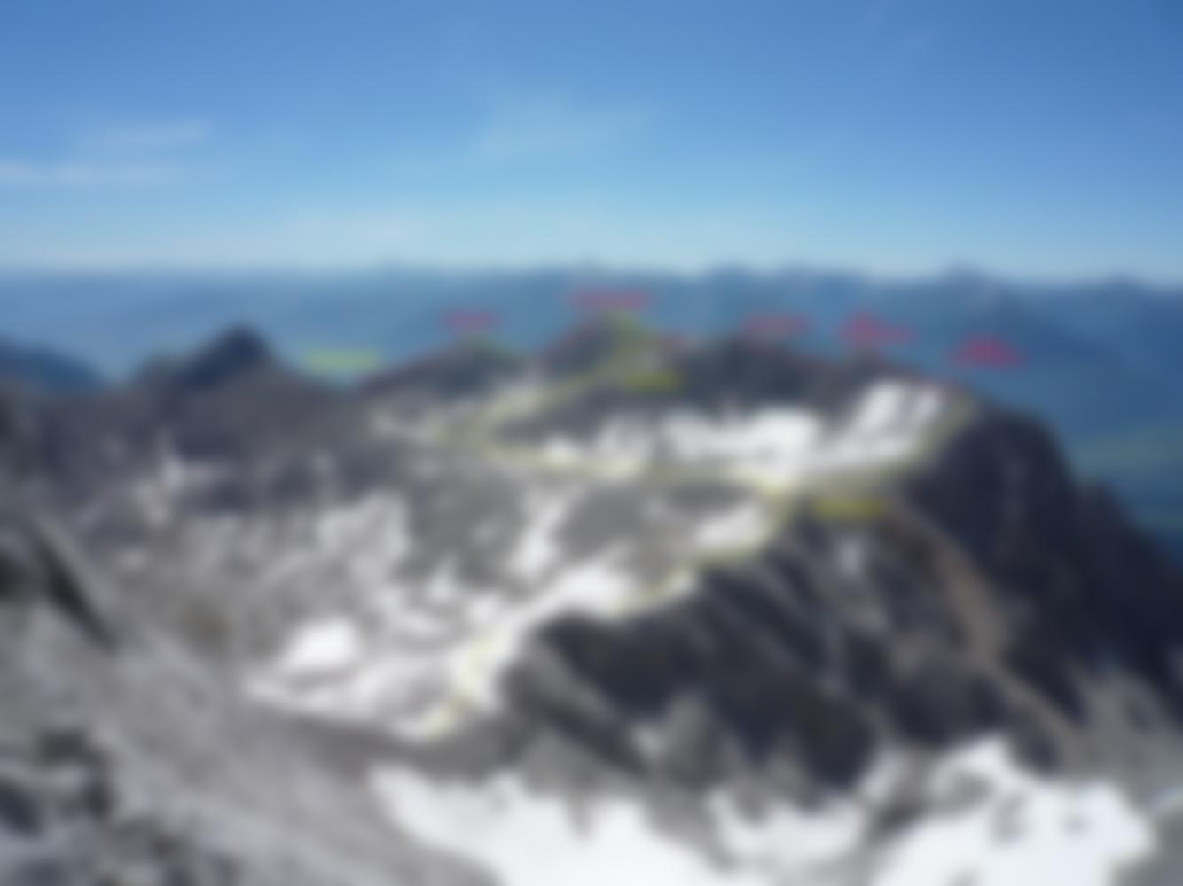 Über Geröllkante zur Niederen Gamsfeldspitze aufsteigen, nun an den Versicherungen entlang, auf- und absteigend und nach einer Scharte steil zur Hohen Gamsfeldspitze aufsteigen. Auf der anderen Seite steil hinunter, der nächste kl. Gipfel wird südlich umgangen, und über eine rampenförmige Rinne wieder auf den Kamm und weiter zum Gipfel der Scheichenspitze. Nun absteigend (meist Geröll, aber auch teilweise versichert) bis zum Hohen Rams, von diesem über Versicherungen und Schutt zur Gruberscharte absteigen.