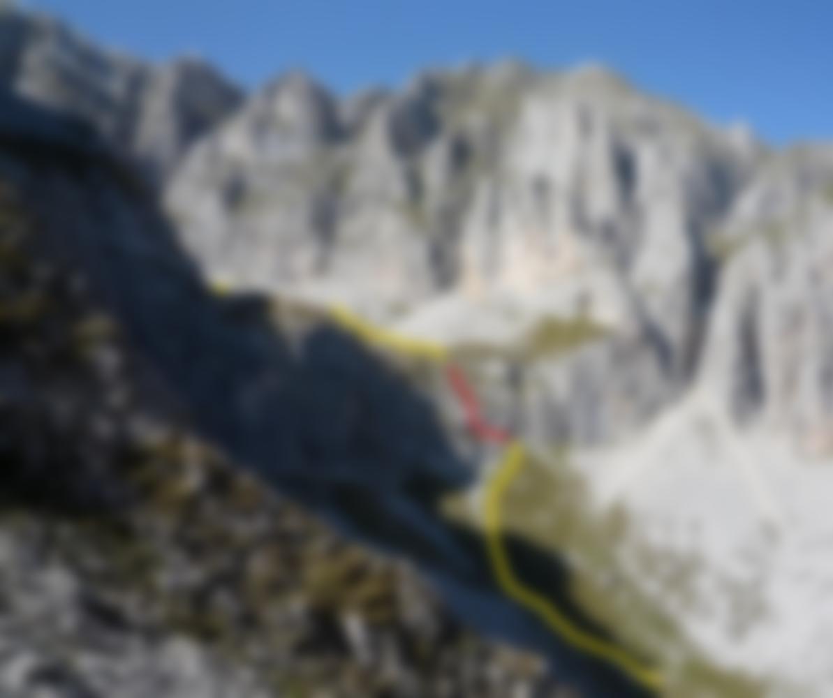 Den Einstieg erreicht man über Sent. d. Palete (B) - Pso. di Palete, 2317 m. Abstieg in die Livezza Grande und bevor man auf den Wiesenboden kommt links über ein kleines Weglein zur Felsstufe. Bei schlechter Sicht besser ganz absteigen und links über die Wiesen zum Einstieg.