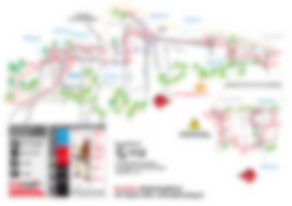 Der Einstieg erfolgt für alle Routen gemeinsam und ist eine überhängende Querung. Danach geht es einfacher weiter, unterbrochen von 1 Passerelle und 1 Seilbrücke. Nach der Teilung der Routen führt der Parcours difficile attraktiv unter einem Felsdach durch und über eine kleine Seilbrücke. Anschließend wartet dann eine lange, meist versicherte Gehstrecke im Wald abwärts, bevor der KS girlandenartig nach rechts aufwärts ansteigt bis zur Wiedervereinigung der Routen. Der Parcours facile in diesem Bereich ist wesentlich kürzer, weist aber eine einzigartige Seilbrücke mit Baumstämmen zum Weiterhangeln auf. Eine riesige Hängebrücke führt bis zum Felsturm `Ron de Picard`, wo sich die beiden Routen wieder trennen: Der Parcours difficile klettert steil aufwärts bis unter ein Felsdach, quert dann extrem abdrängend darunter durch. Dann ausgesetzt weiter bis zu einem engen Spalt. Danach leichter weiter zur Absprungbrücke für die Tyrolienne. Der Parcours facile quert hinter den Felsturm hinein und steigt dann in einem Spalt steil auf Bügeln hinauf bis zur Tyrolienne Nach der Tyrolienne verläuft der vereinigte Parcours außen um den nächsten Felsturm herum, dann wird abgeklettert, mit 1 Balken und 1 Seilbrücke. Eine lange versicherte Gehstrecke führt dann unter den Turm Rochefort mit dem E/F-Dach. Bügel führen hier steil hinauf bis zu einer weiteren Verzeigung, links hinüber zum Überhang, rechts auf D/E daran vorbei. Unten auf der Normalroute geht es leicht abwärts zu einer Seilbrücke, danach auf Bügeln steil hoch, danach folgt wieder eine Verzweigung: Links die leichtere Route über 2 Passerelles, rechts ein anspruchsvoller Ausstieg mit einem kleinen D/E-Überhang