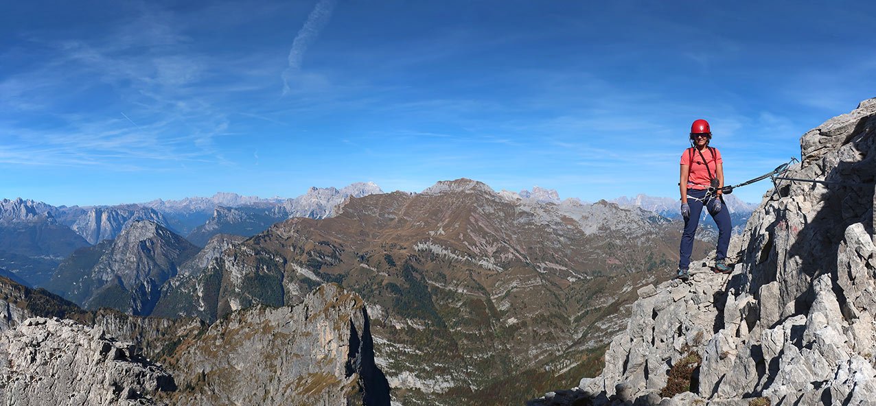 Von den Schiara-Klettersteigen gehört die Ferrata Sperti sicher zu den wildesten, steigt man doch oben direkt durch eine große Schlucht auf den Schiara- Kamm. Gerade dieser Umstand macht den Steig zum attraktiven Ziel. Man ist meist mit wenigen Gleichgesinnten unterwegs. Hat man den Kamm erreicht und die zahlreichen kleinen Stufen an der Rückseite gemeistert, steht man direkt beim Felsenfi nger „Gusela del Vescova“ - einem der Schiara-Wahrzeichen. Je nach Ausdauer und Kondition steigt man danach entweder über die Ferrata Zacchi ab oder hängt die Ferrata Berti zum Hauptgipfel der Schiara an.