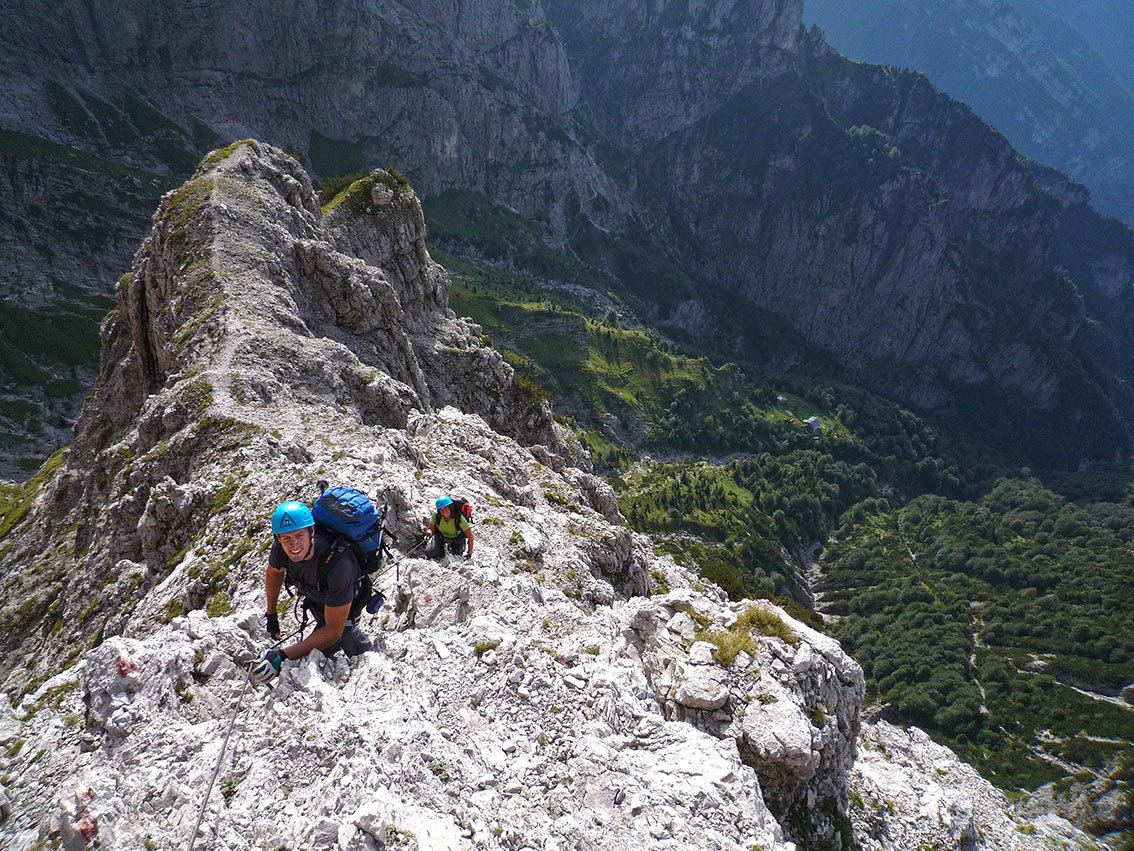 Die Ferratas Zacchi und Marmol liegen direkt oberhalb der Alpinihütte und gelten als Herzstück des Klettersteiggebietes im Schiarakessel. Vor allem die kühne Ferrata Zacchi mit dem grandiosen Finale an einem ausgesetzten Pfeiler wird gerne als Auftakt zur Schiaraüberschreitung (Traverse) gemacht. Die Ferrata Marmol ist der klassische Abstiegsklettersteig (oder dient als Zustieg zum Sentiero Alpinistico Monte Pelf) für all jene, die über die Sperti oder Zacchi aufgestiegen sind und die Gipfelüberschreitung der Schiara auf der Berti gemacht haben. Landschaftlich einzigartig ist vor allem das Ende der Ferrata, steht man doch in unmittelbarer Nähe des Gusela-Felsturmes und kann den Blick - klares Wetter vorausgesetzt - bis zum Meer schweifen lassen.