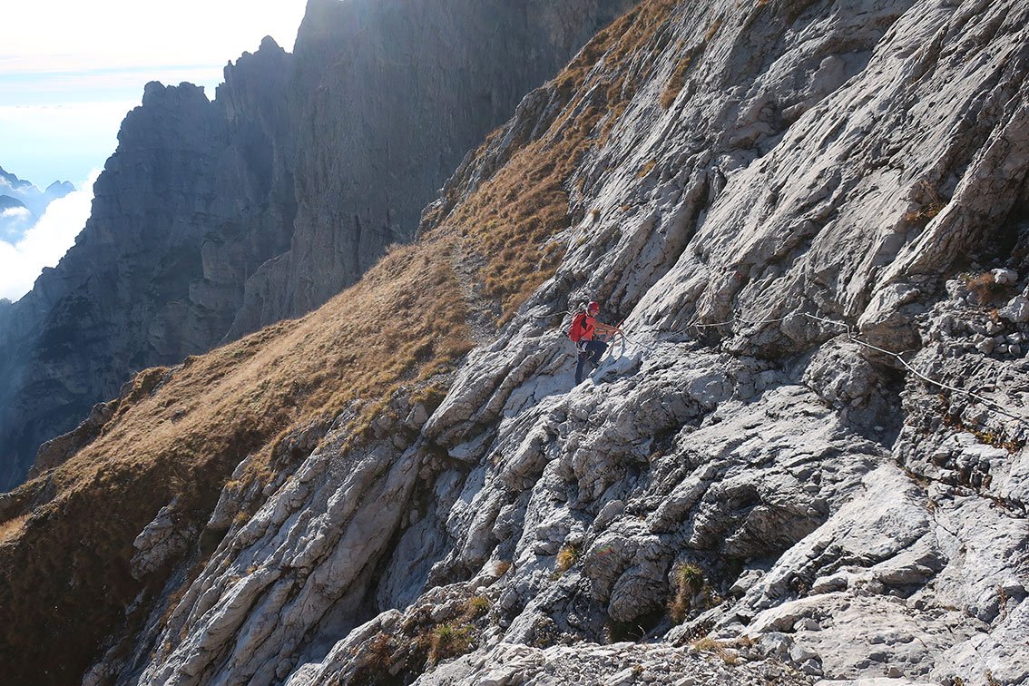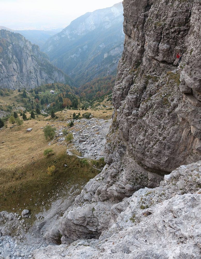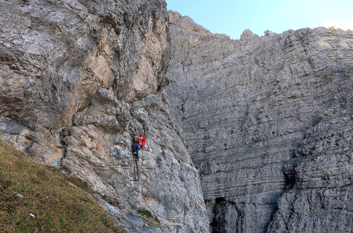 Via ferrata Zacchi (C, 620 Hm, schwierig): Nach rechts in den Kamin, zwei Leitern hinauf (B) und über ein schmales, überdachtes Band nach links zu einem Rinnensystem, davor ist die Abzweigung der Ferrata Màrmol. Durch die Rinnen (B/C) mit Leitern auf einen Latschenabsatz. Dann nach links zum gestuften Beginn eines rampenartigen Grates. Nach einer mit Klammern versehenen Felsstufe (A/B) kommt man zur Schlüsselstelle - einer mit Seil versehenen steilen Rinne (C). Danach aufwärts (A, dann A/B) mit kurzer Leiter (B), bis man auf einen markanten Grat mit Steinmann kommt. Dem immer steiler werdenden Grat anfangs zu Fuß, dann versichert (A) zu einer Rampe (bis B) folgen, die zum Abschlusspfeiler führt. Unmittelbar davor noch eine exponierte Ecke (B/C). Auf Leitern (B/C), dann leichter zum Ende des Pfeilers. Eine letzte exponierte, versicherte Stelle (A) führt zum Biv. della Bernardina, 2320 m. Kurz davor zweigt rechts die Ferrata Berti ab.