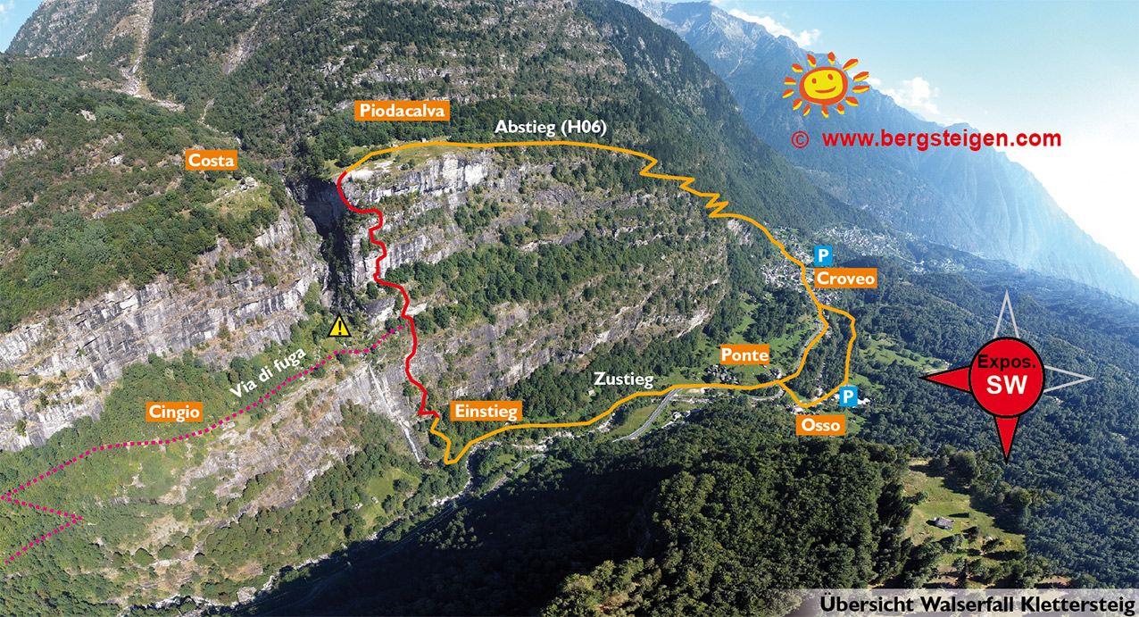 Vom Parkplatz in Osso über die Brücke zur Häusergruppe Ponte und auf der anderen (östlichen) Bachseite der Straße, später auf einem Weg, am Ende einem Pfad dem Bach entlang zum Wasserfall folgen. Dort steht eine Infotafel, vom Wasserbecken steigt man im Zickzack durch lichten Wald zum Einstieg auf. Man kann auch direkt vom Ortskern von Croveo starten - der Zustieg zum Klettersteig ist beschildert (kleine, viereckige Schildchen "Via Ferrata Walserfall").