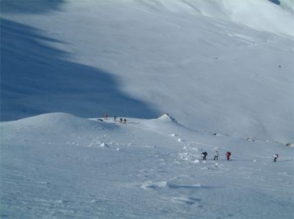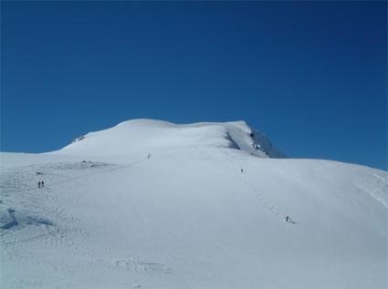 Über die Werksstrasse (mit kl. Tunnel) erreicht man die Kühtauern wo man entweder links oder rechts eine steile Erhebung umgeht und den Schwarzkarlsee erreicht. Hier steiler hinauf zu den Südwesthängen des Mitterbirg (steilstes Stück der Tour). Von dort weiter querend zu Punkt 2870, hier steigt man auf das Obere Hocheiserkees - hier tut sich der fantastische Blick zum Wiesbachhorn das erste Mal auf. Auf dem Gletscher südwärts, zuerst flach, dann steiler auf einer Art Firnschneide zum höchsten Punkt (3206m).