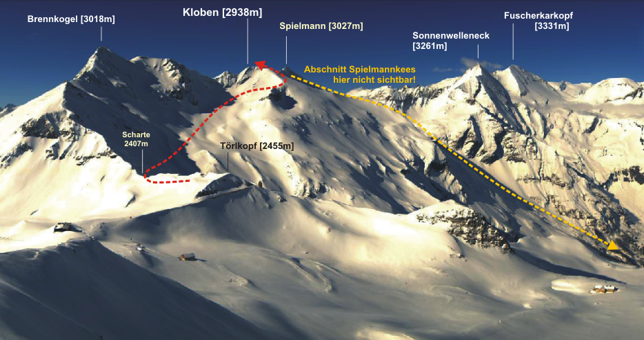Vom Fuschertörl quert man ziemlich eben hinüber zum Brennkogelkees (am Morgen infolge Vereisung oft etwas heikel). Weiter ohne Probleme in einem Rechtsbogen auf den Grat und in Kürze zum Gipfel des Kloben.