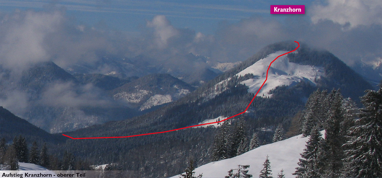 Schöne Skitour auf ein markantes Felshorn hoch über dem Inntal. Schöner Blick ins Inntal und ins Kaisergebirge. Das Kranzhorn hat zwei Gipfelkreuze - das schlichte, dem Inntal nähere ist das österreichische Gipfelkreuz, das etwas protzige (goldene) ist das Gipfelkreuz auf deutschem Staatsgebiet. Unterhalb des Gipfels steht eine kleine Kapelle, angeblich sollen die Nazianalsozialisten die Heiligenfigur ins Tal geworfen haben, sie wurde laut Überlieferung später von einer alten Frau unversehrt gefunden und wieder zurück zur Kapelle gebracht.