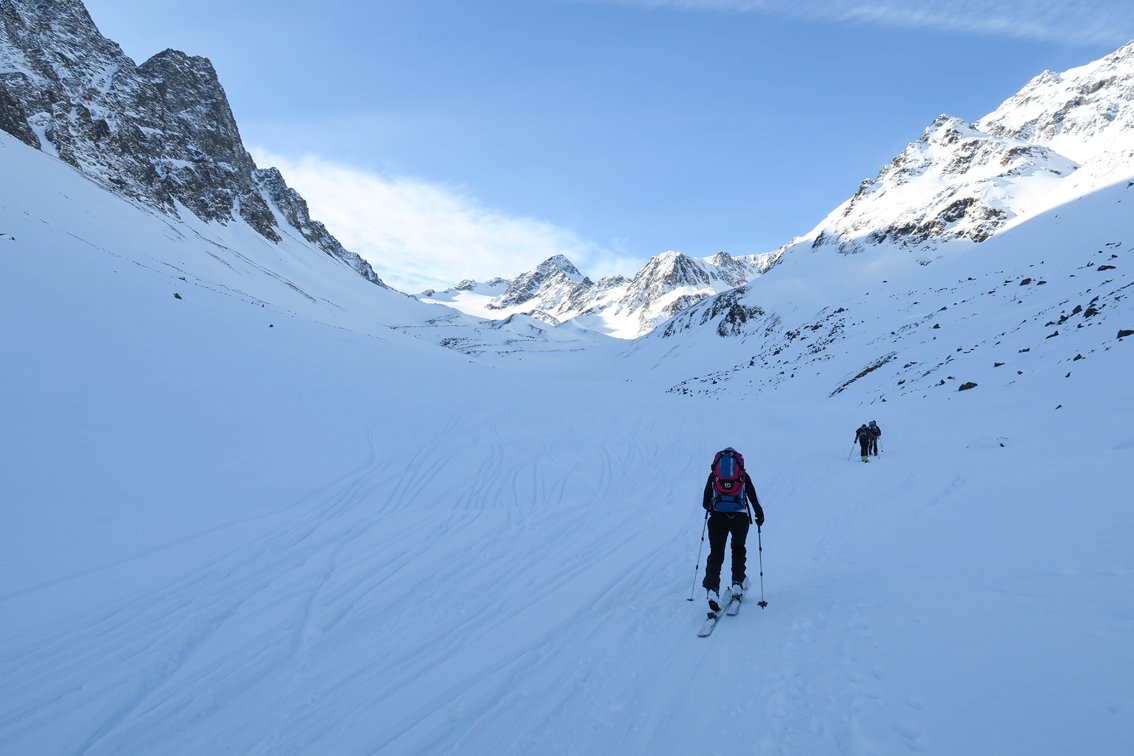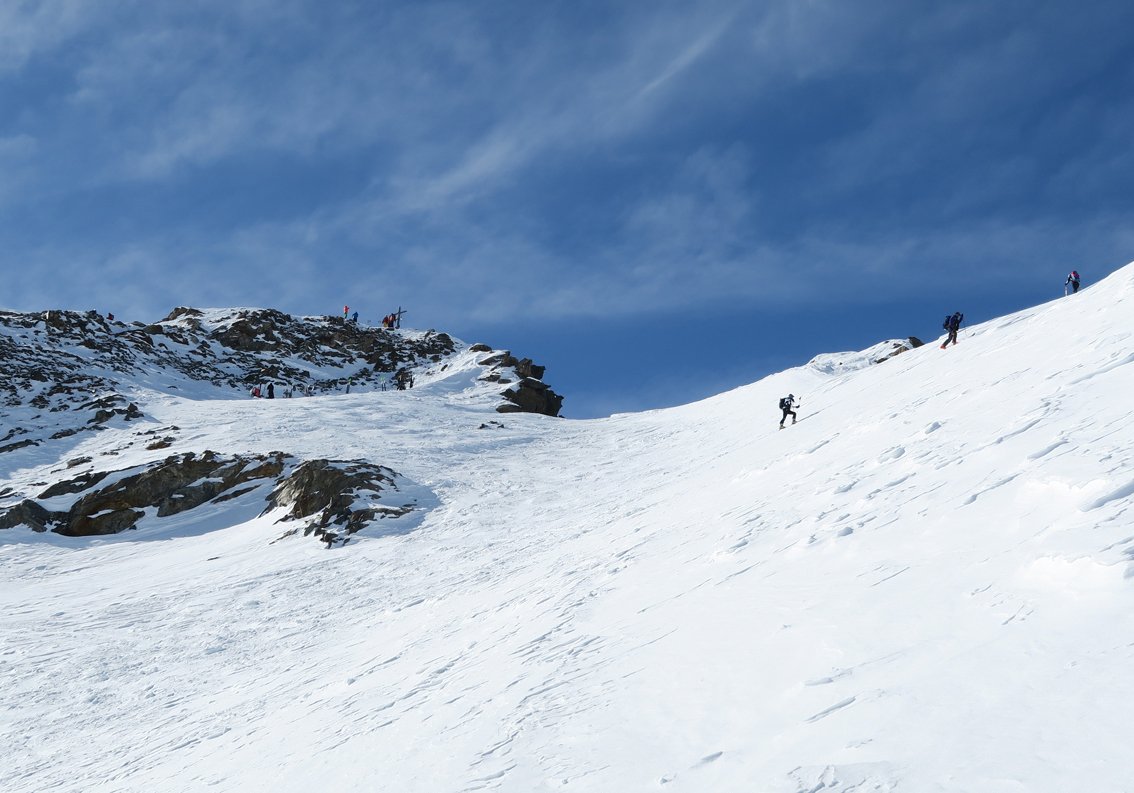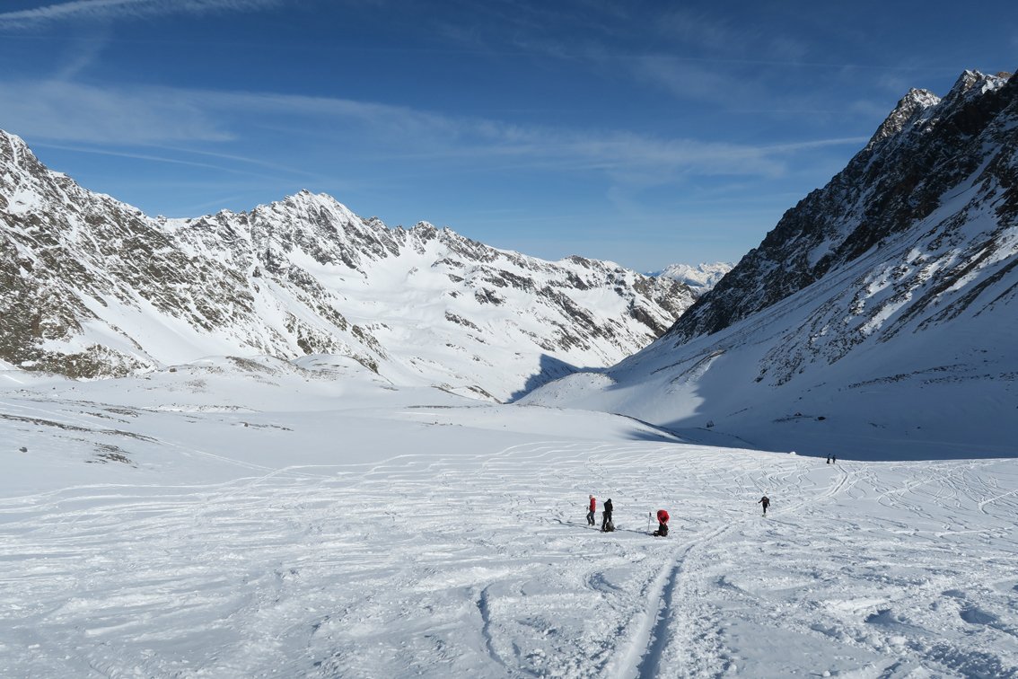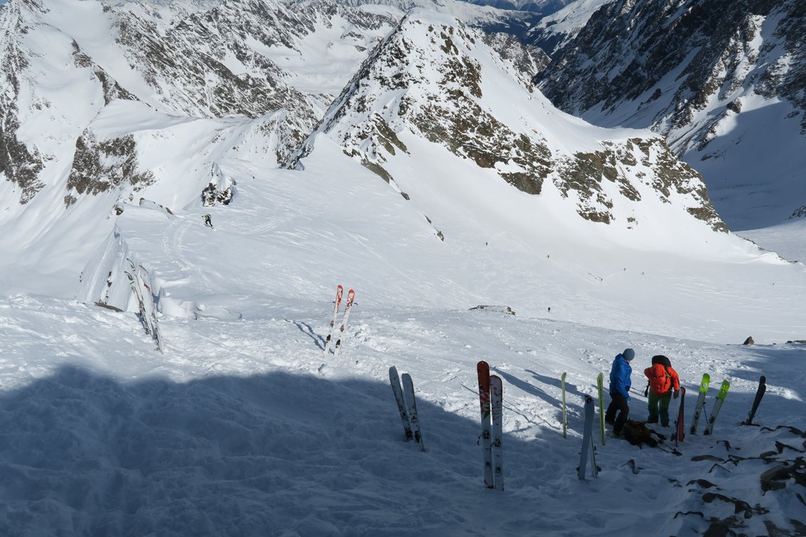 Auf dem Längentalferner hält man sich eher östlich, um eine Spaltenzone unterhalb des Bachfallenkopfes zu meiden.
