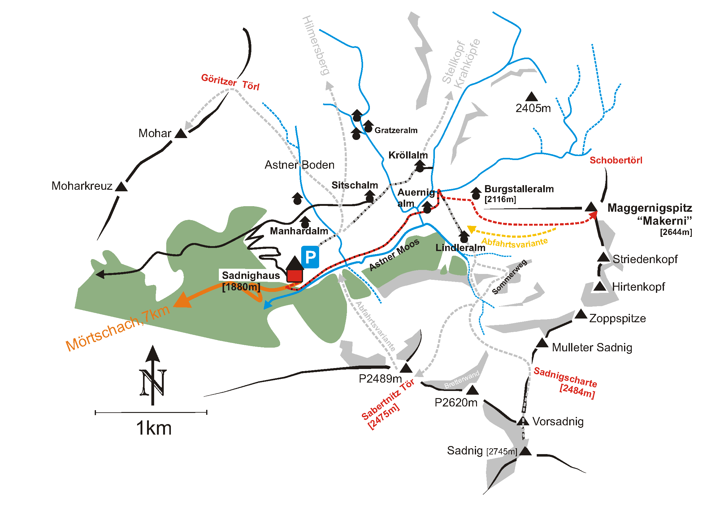 Der Makerni lacht einen schon regelrecht an, wenn man in die Hintere Asten fährt. Wie die meisten Touren um das Sadnighaus ist auch die Tour auf den Makerni mit 750 Höhenmetern recht kurz, dafür aber knackig! Der Westhang ist die Steilheit betreffend sehr homogen und immer über 30 Grad steil- deshalb sollte man ihn nur bei sicheren Verhältnissen machen.