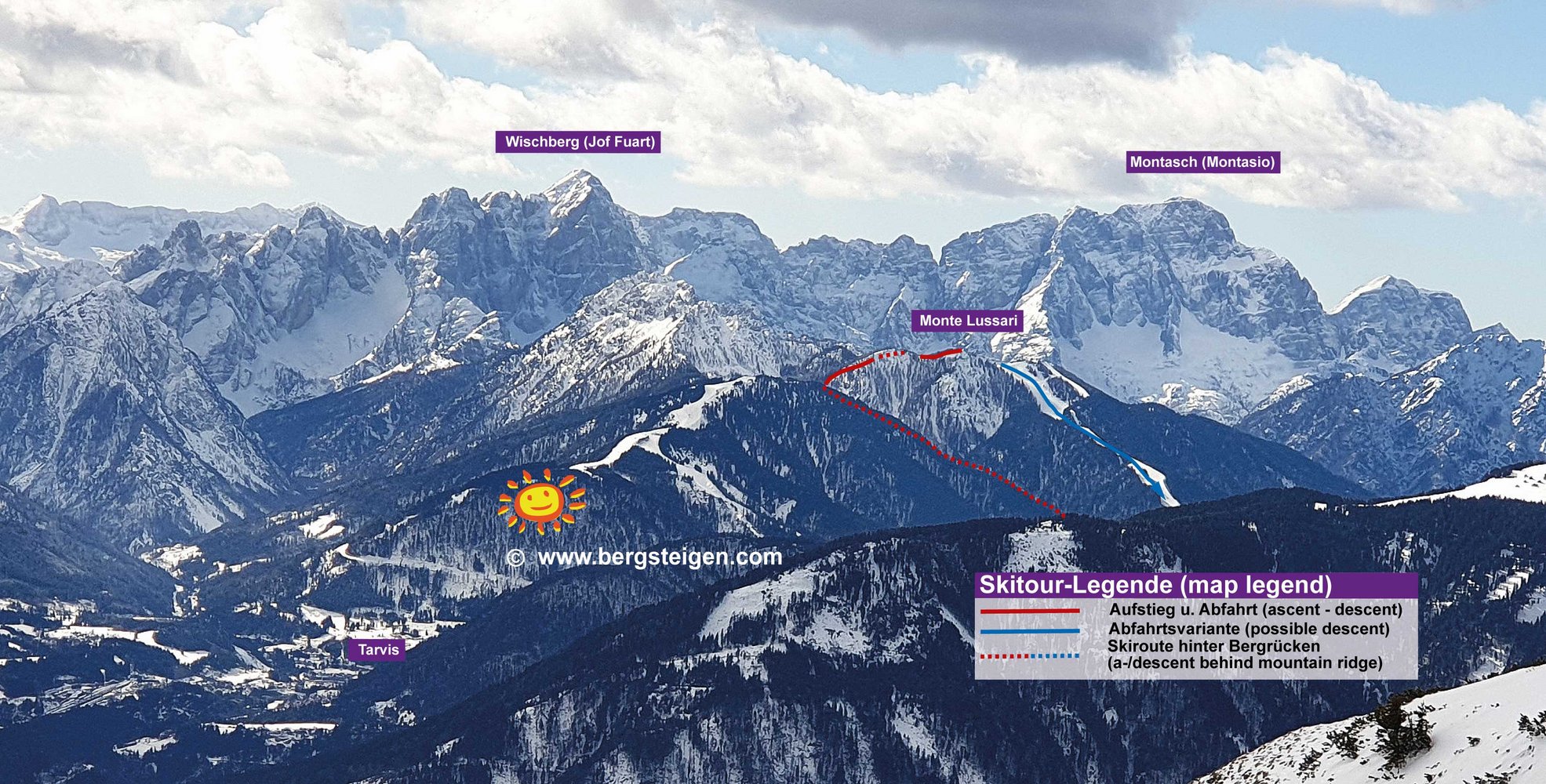Aufstieg: Vom Parkplatz weg geht es über den Bach und dann der Asphaltstraße aufwärts folgend hinter die kleine Häusergruppe bis zum Beginn des Grabens (grüne Infotafel). Hier beginnt der Pilgerweg, der sich immer an der linken Grabenseite hinauf zur Lussari Alm (Piste) zieht. Kurz vor der Piste geht der Weg rechts (Westen) über den bewaldeten Kamm hinauf auf einen Sattel. Man überquert die Piste und erreicht in wenigen Minuten den Gipfel des Monte Lussari.