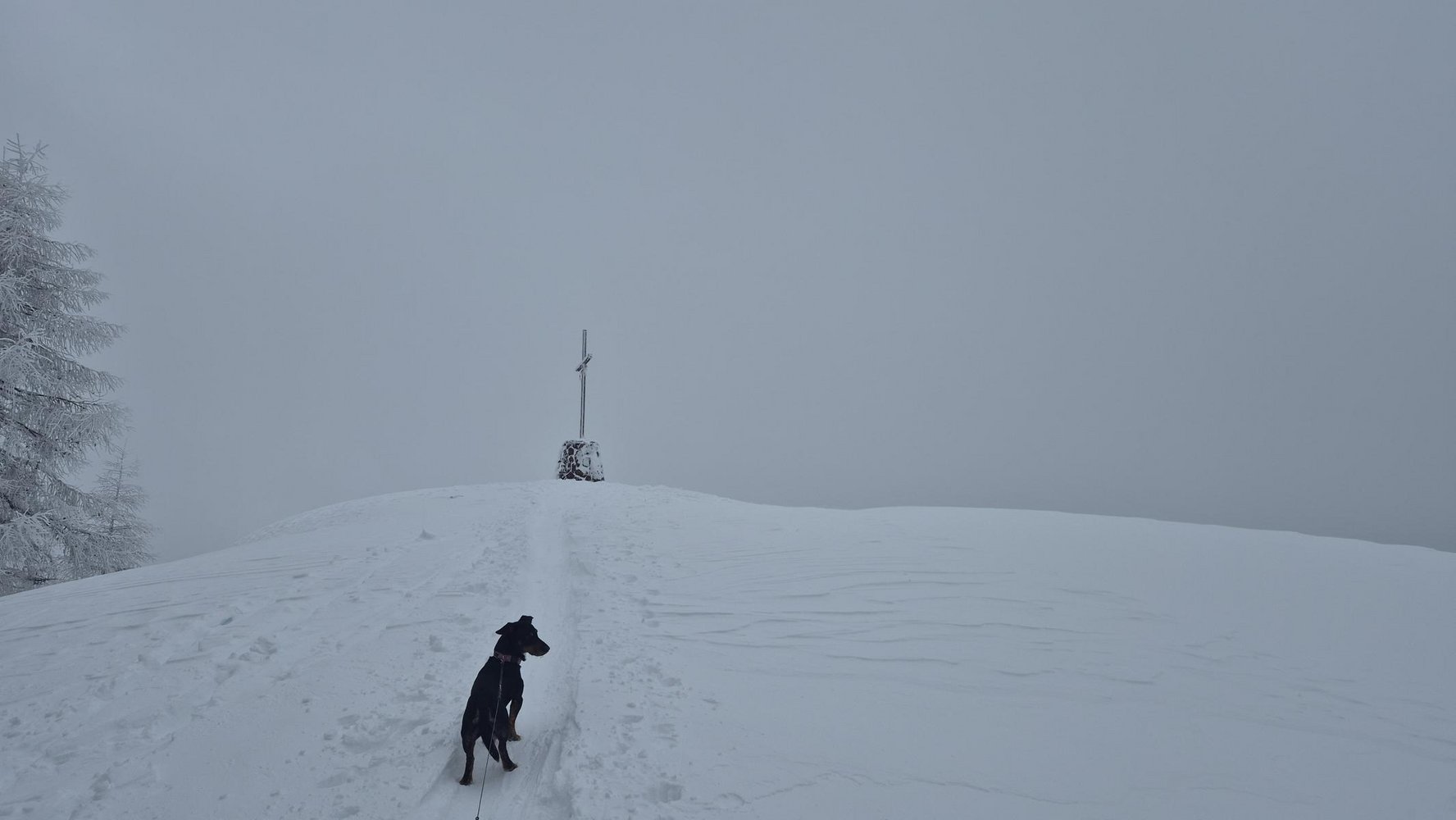 Auf dem letzten Sattel. Durch die Schneise hinter dem Kreuz geht es auf den Gipfel.