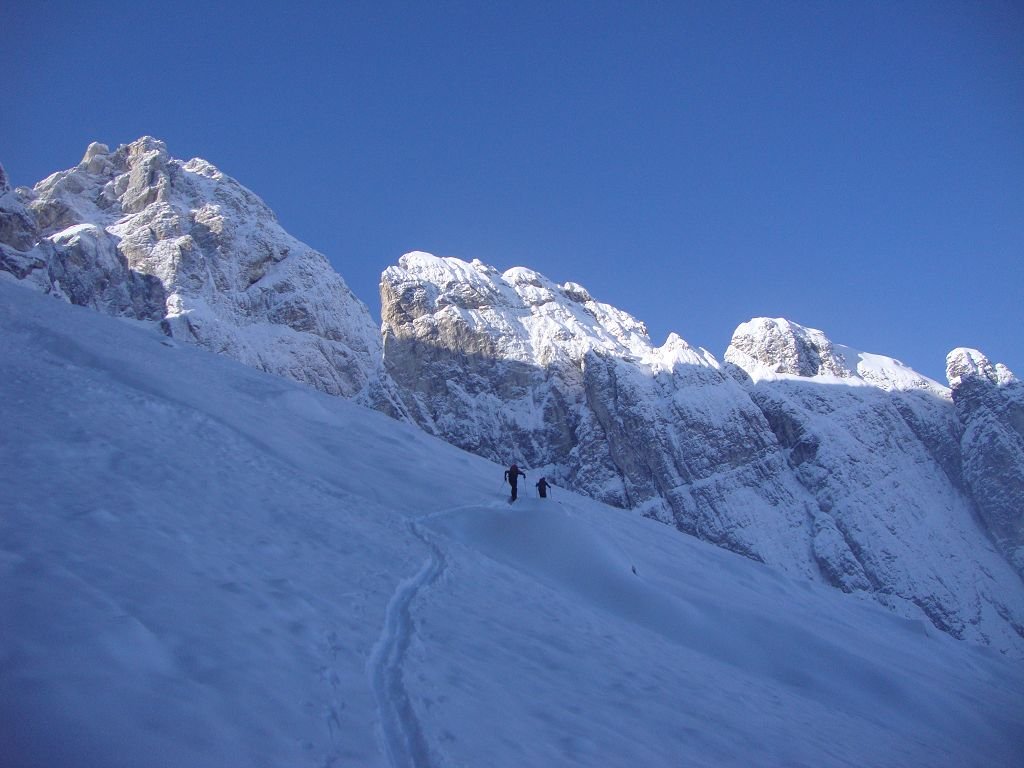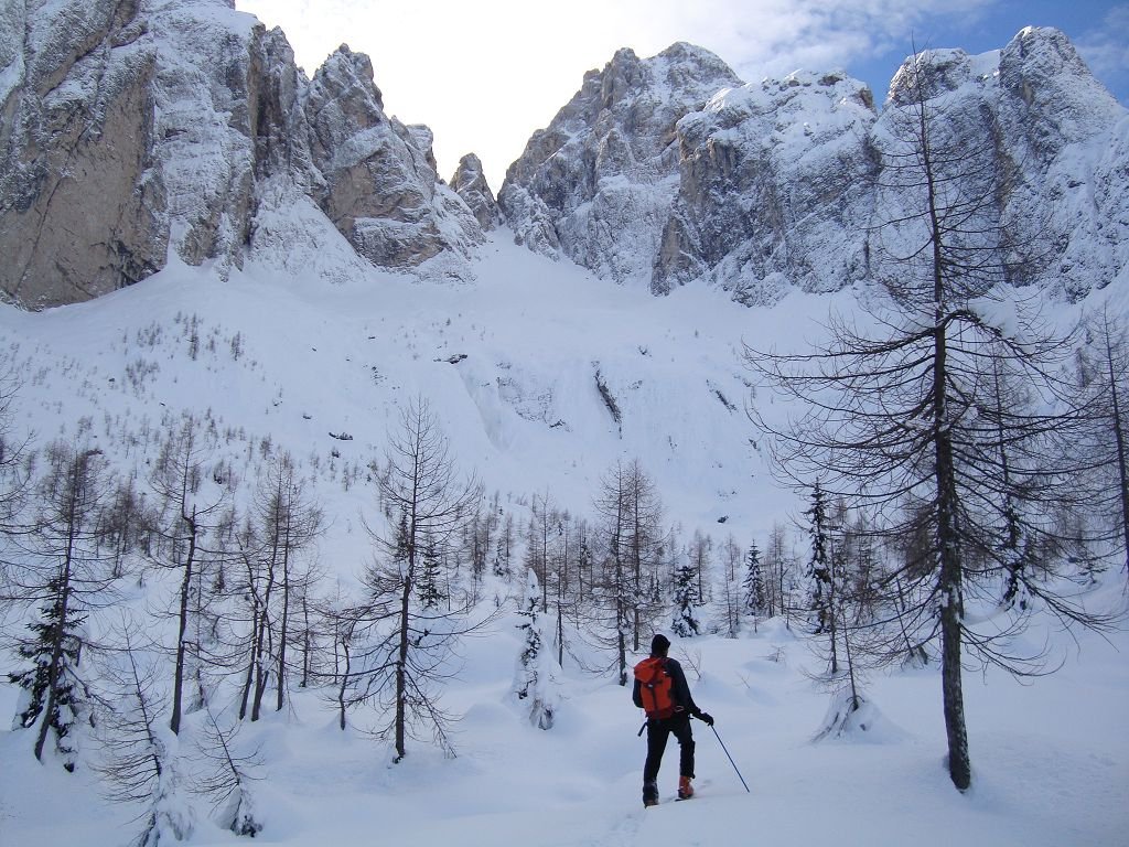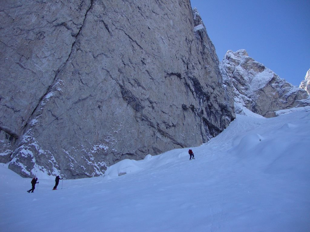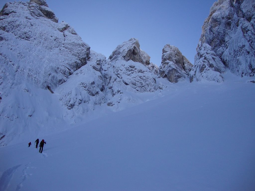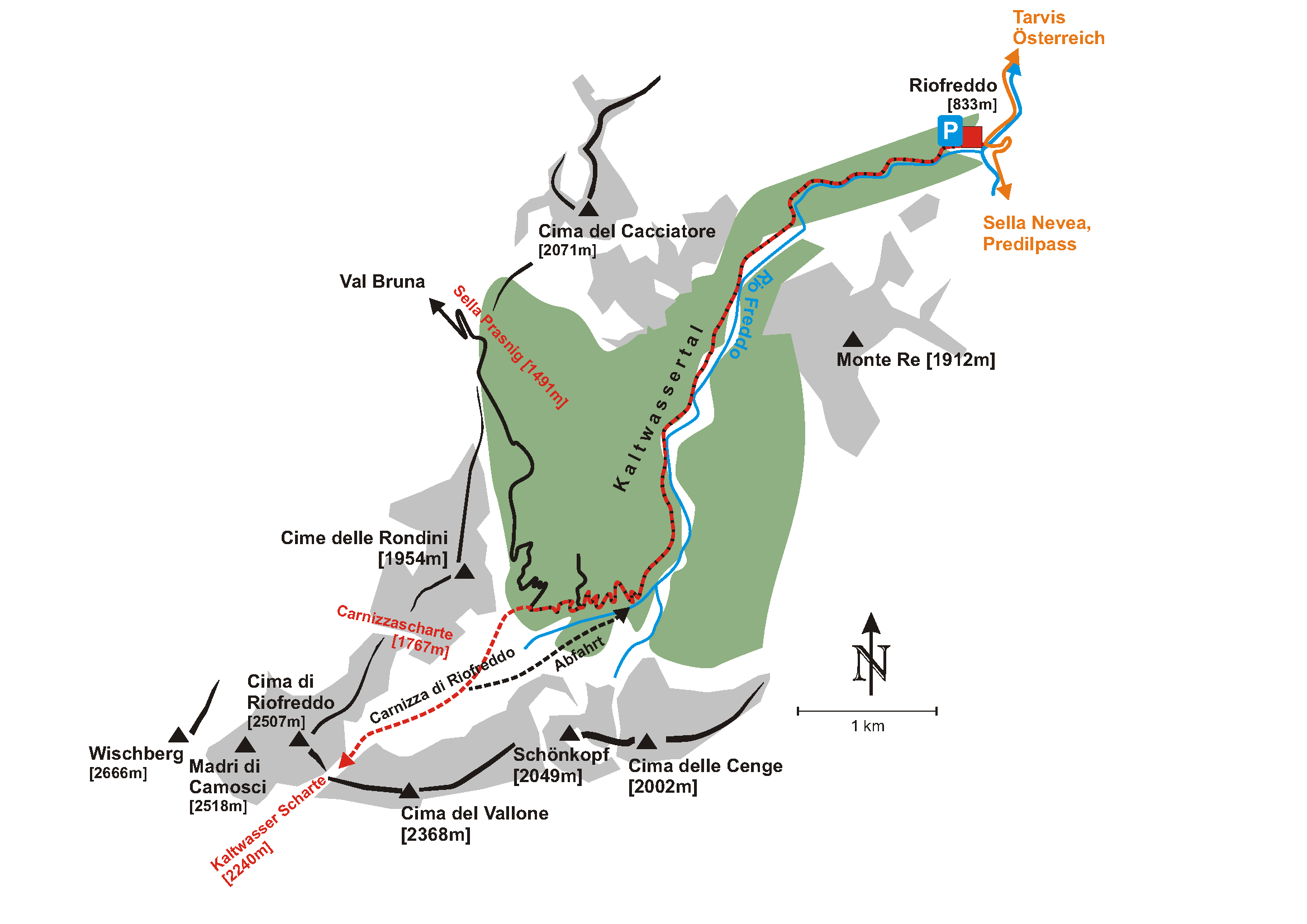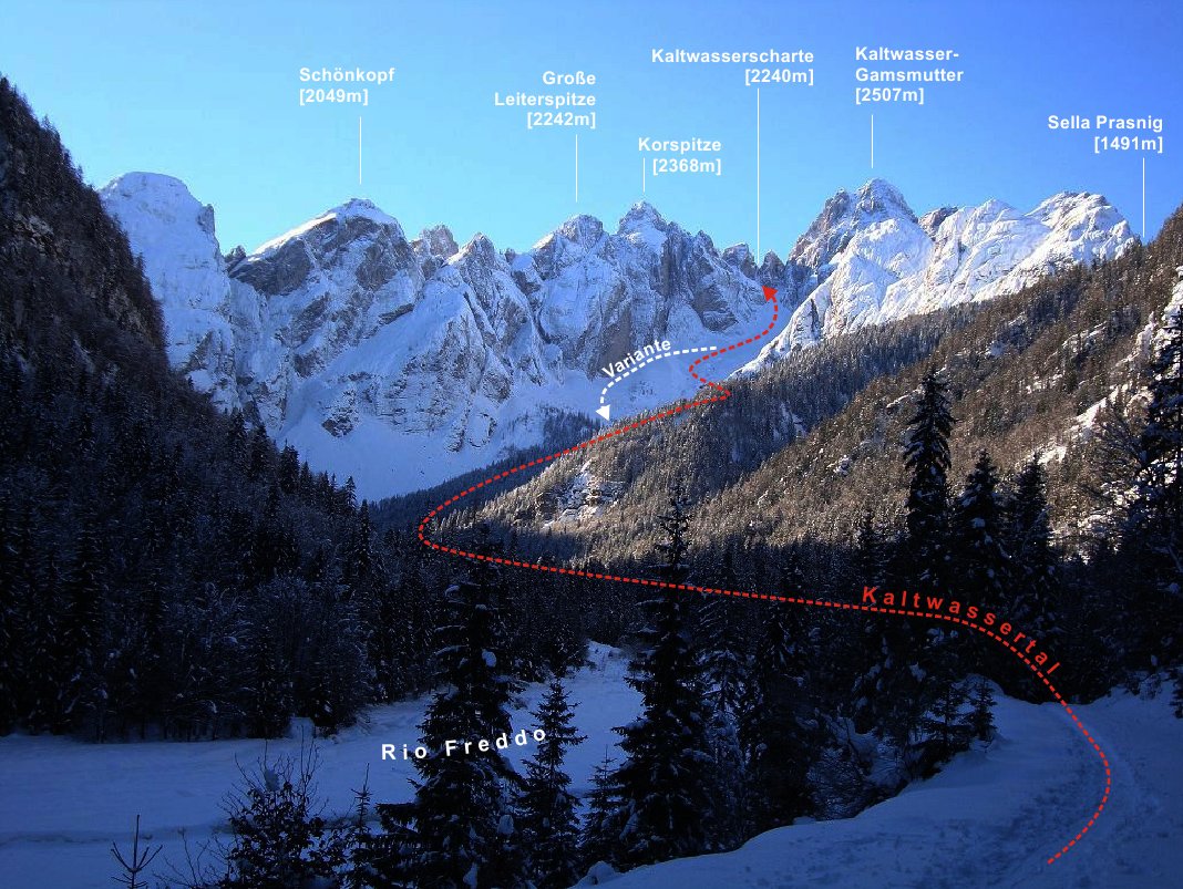 Vom Parkplatz in Riofreddo (833m) auf der Forststraße entlang des Bachs ins Kaltwassertal. Nach ca. 5 Kilometern wird die Forststraße steiler und schlängelt sich in Kehren hinauf zum Sella Prasnig (1491). In einer markanten Kehre auf ca. 1325m (unter den Cime delle Rondini) zweigt man auf den Sommerweg (Nr. 618) ab und zieht dem Geländeverlauf folgend in das offene Kar „Carnizza di Riofreddo“. Nun immer weiter hinauf bis sich das Kar zu einer Rinne verengt. Hier macht man das Skidepot, je nach Schneeverhältnissen kann man auch über den dunklen Schlund zur Scharte hochklettern (Steigeisen/Pickel! Im Sommer kurzer versicherter Klettersteig mit Leitern).