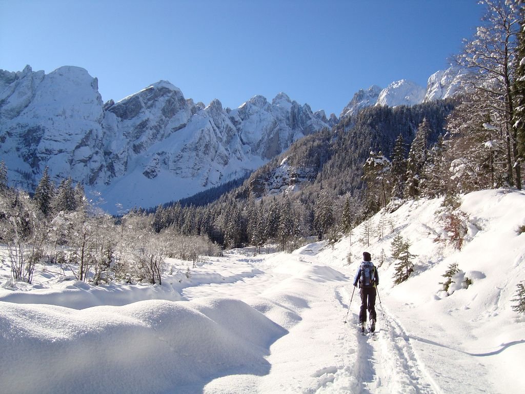 Von Tarvis: über die SS 54 Richtung Cave del Predil (Raibl). Auf zirka der Hälfte der Wegstrecke liegt das alte Bergbauörtchen Riofreddo, wo einst das Erz aus Cave verhüttet wurde.
