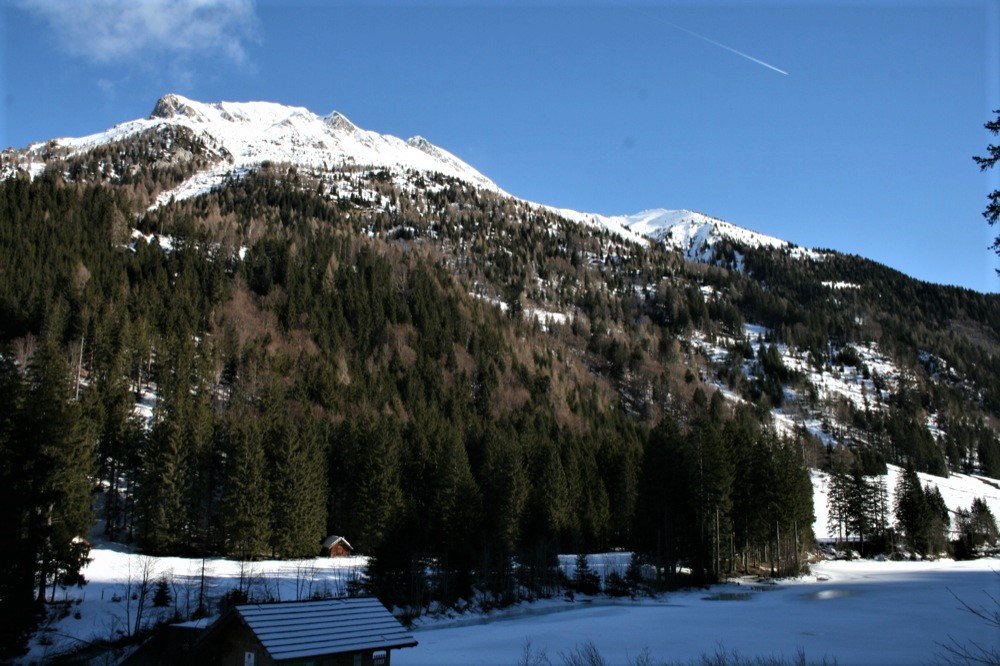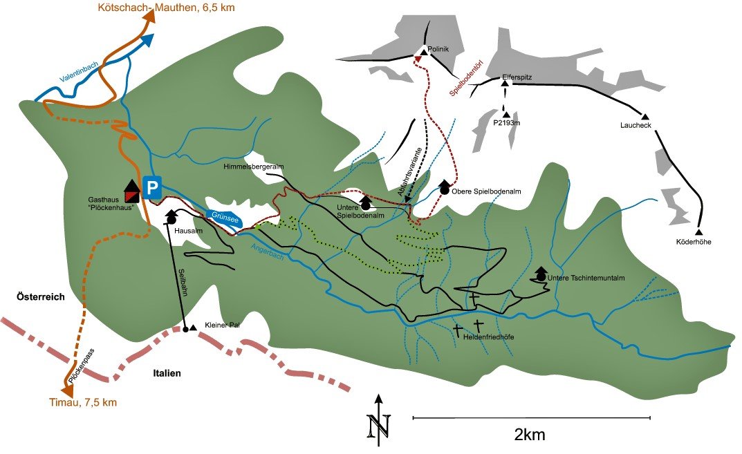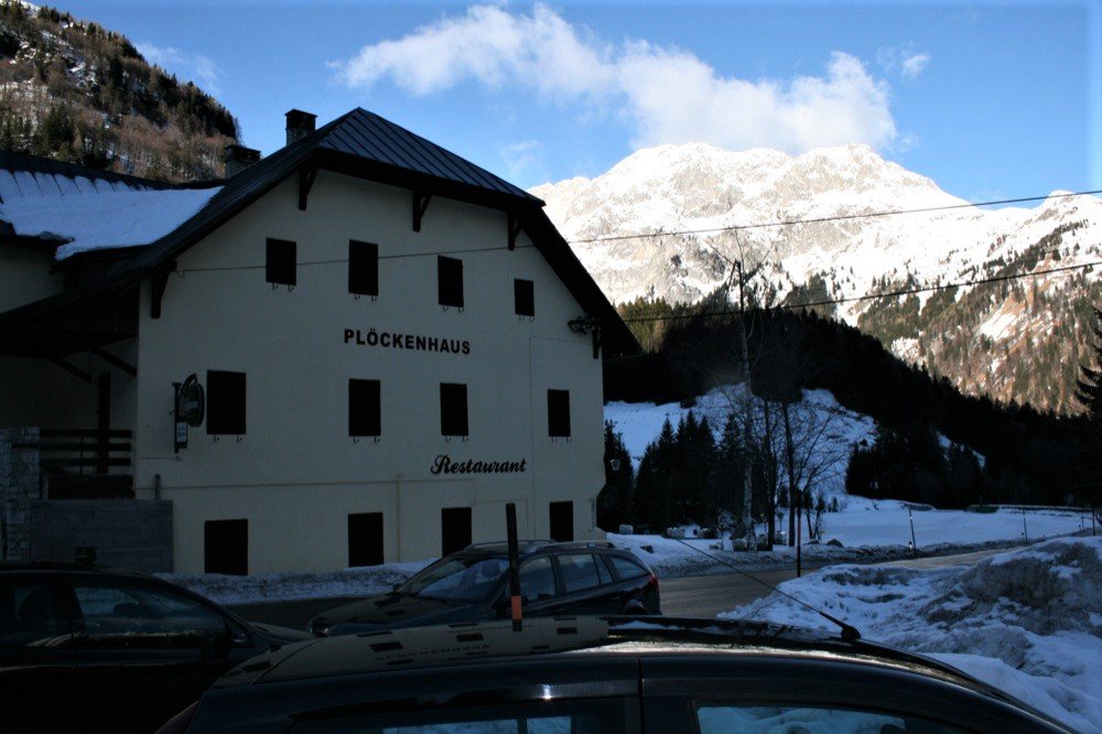 Von Kötschach- Mauthen (707m) fährt man über die B110 Plöckenpass Straße Richtung Plöckenpass. Etwa 1,7 Kilometer vor der Staatsgrenze befindet sich das Gasthaus „Plöckenhaus“, das im Winter geschlossen hat und jetzt als Ausgangspunkt dient.